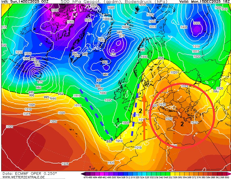 Carte 1 issue du modèle ECMWF : projection pression 500hpa lundi 15 décembre 2025 à 18h