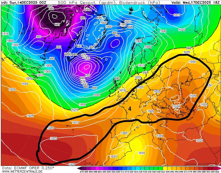 Carte 2 issue du modèle ECMWF : projection pression 500hpa mercredi 17 décembre 2025 à 18h