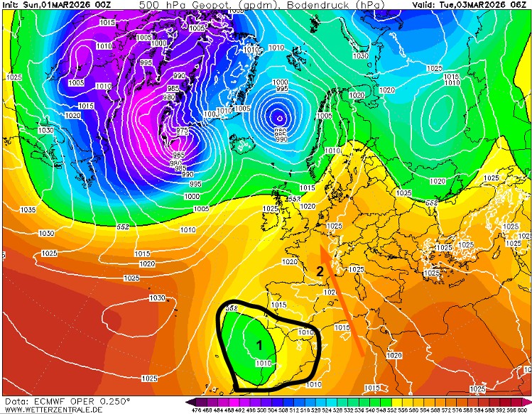 Et pour cause, un système dépressionnaire (1) positionné sur le Maroc advectera un flux de Sud/Sud-Est (2) très doux vers la France. Si la douceur sera probablement moins extrême par rapport à cette semaine, la fonte nivale va reprendre en-dessous de 2000-2300m, notamment sur les versants ensoleillés. En terme de qualité, il s’agira logiquement d’une neige de printemps dans les domaines skiables. Côté ciel, l’ensoleillement sera parfois contrarié par des passages nuageux venus de Méditerranée, mais les précipitations s’annoncent extrêmement rares. A partir de jeudi, le système dépressionnaire (3) va se décaler vers les Baléares. A cet effet, de l’instabilité venue d’Espagne pourrait déborder vers les massifs méridionaux.