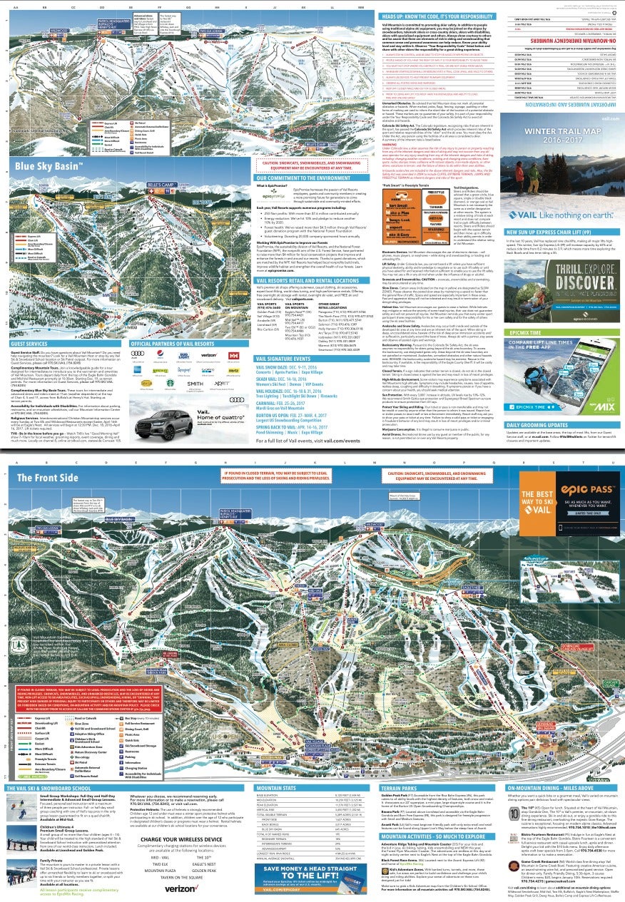 Le domaine skiable de Vail s’étend sur 2 151 hectares (5 317 acres) répartis en trois zones : la face avant, les Back Bowls et Blue Sky Basin. L’altitude varie de 2 475 m à 3 527 m, avec un dénivelé de 1 052 m. Les remontées incluent télécabines, télésièges rapides, classiques et téléskis.