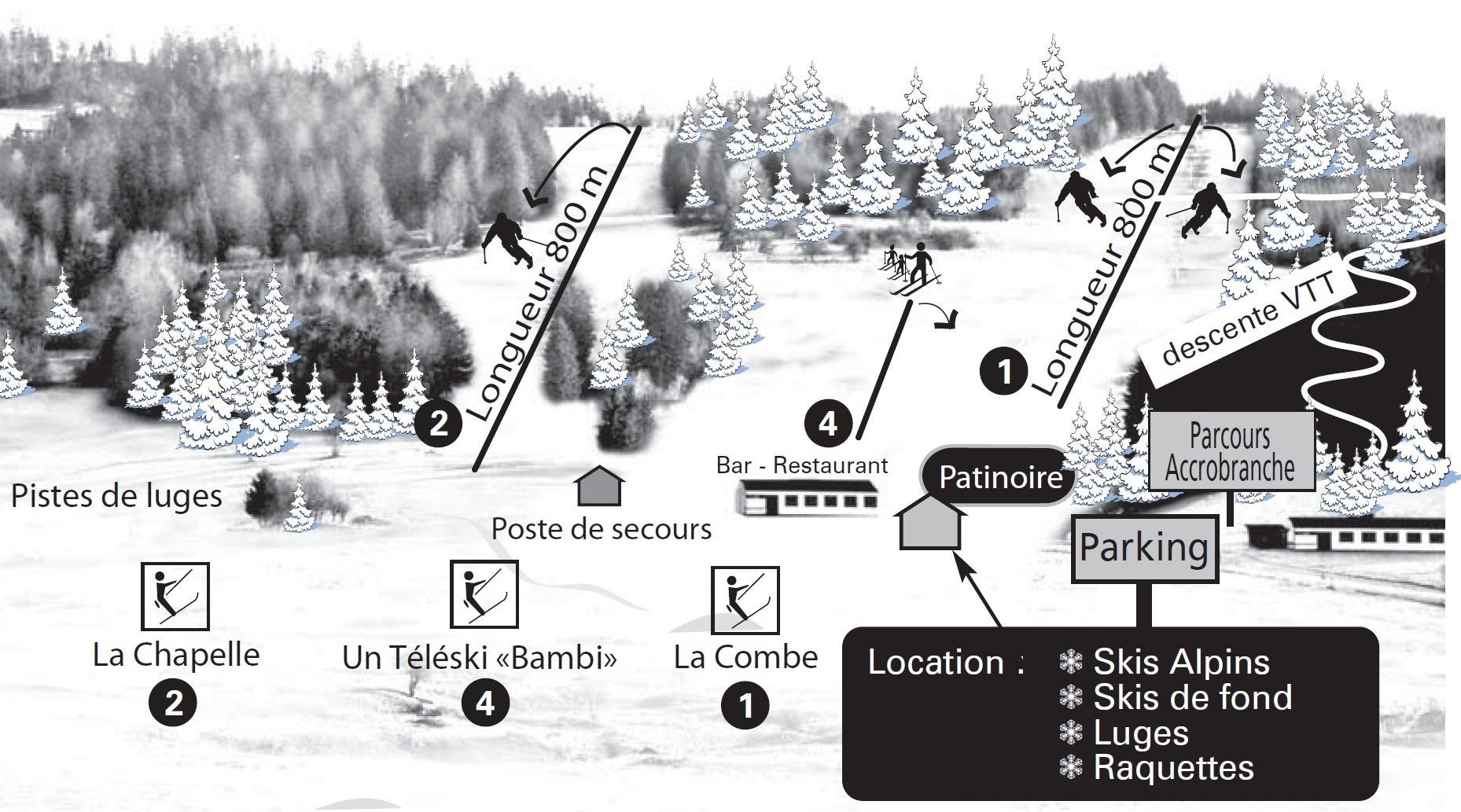 Domaine skiablePistes vertes50%Pistes bleues50%Nombre total de pistes4Piste la plus longue1.1 kmDomaine skiable3 km