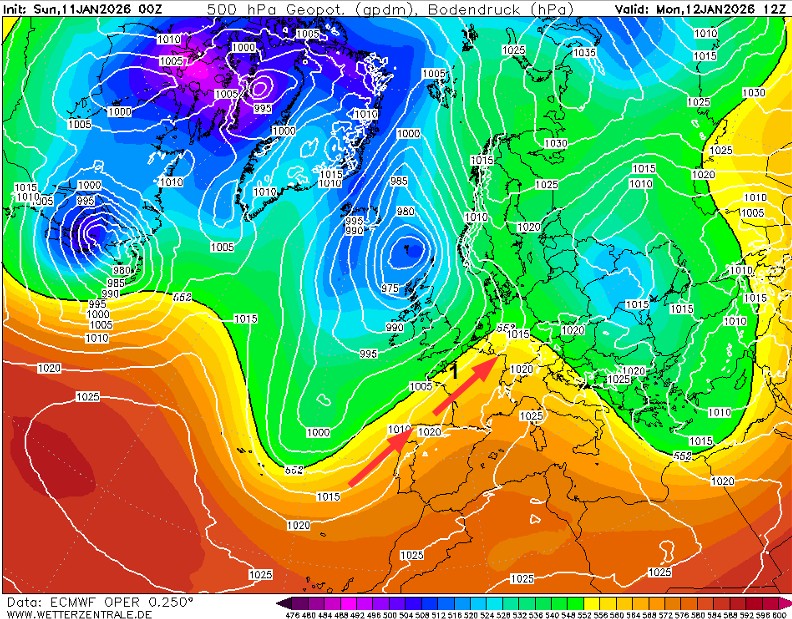 Carte 1 issue du modèle ECMWF : projection pression 500hpa lundi 12 janvier 2026 12h