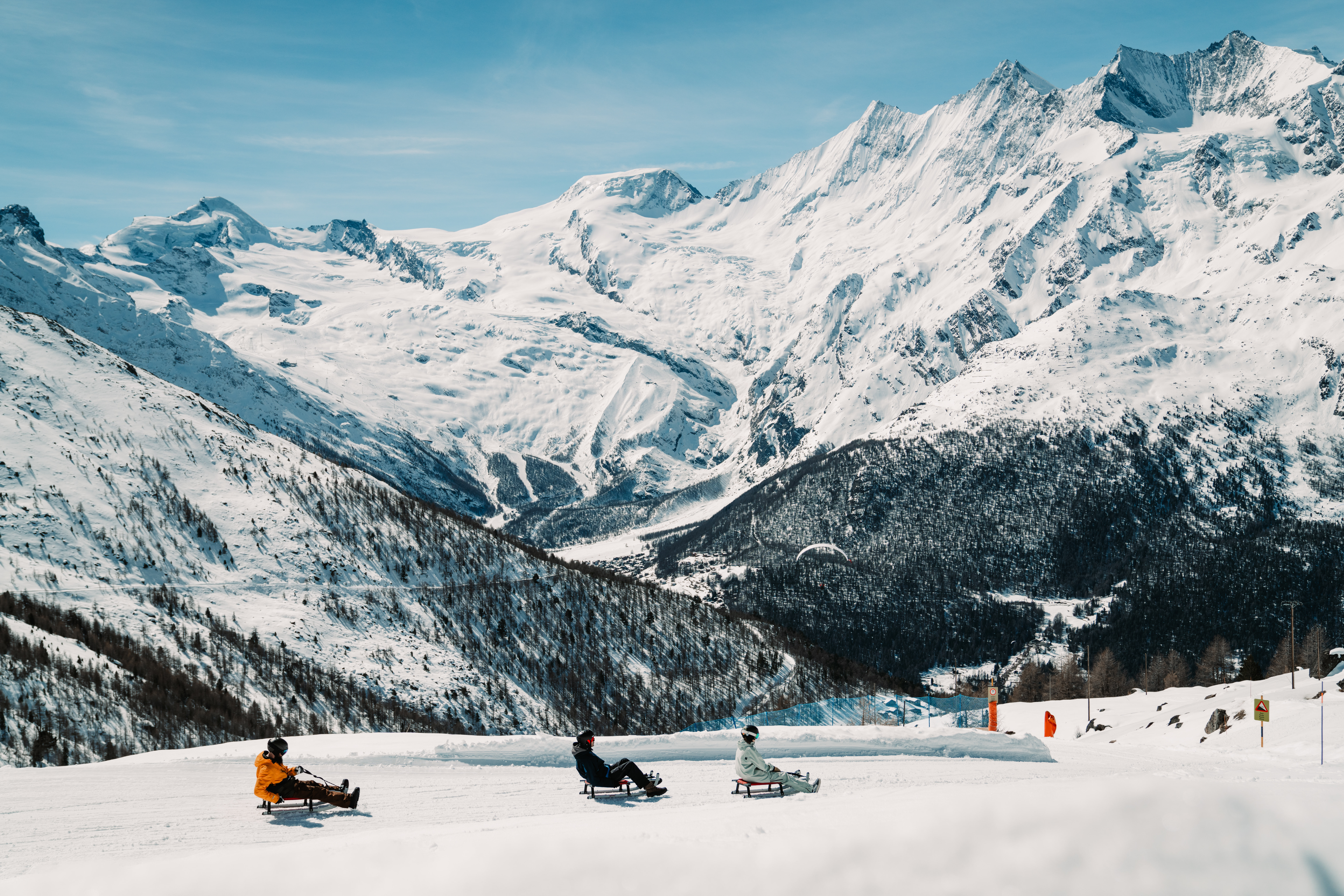 Les plaisirs de la glisse ne s’arrêtent pas au ski. Trois pistes de luge offrent des moments inoubliables dans le Vallée de Saas. La plus longue, de 11 km, relie Kreuzboden à Saas-Grund et fait partie des descentes les plus impressionnantes des Alpes. À Saas-Fee, une piste de luge interactive propose des défis ludiques, tandis qu’une autre descente conviviale complète l’offre à Saas-Almagell.