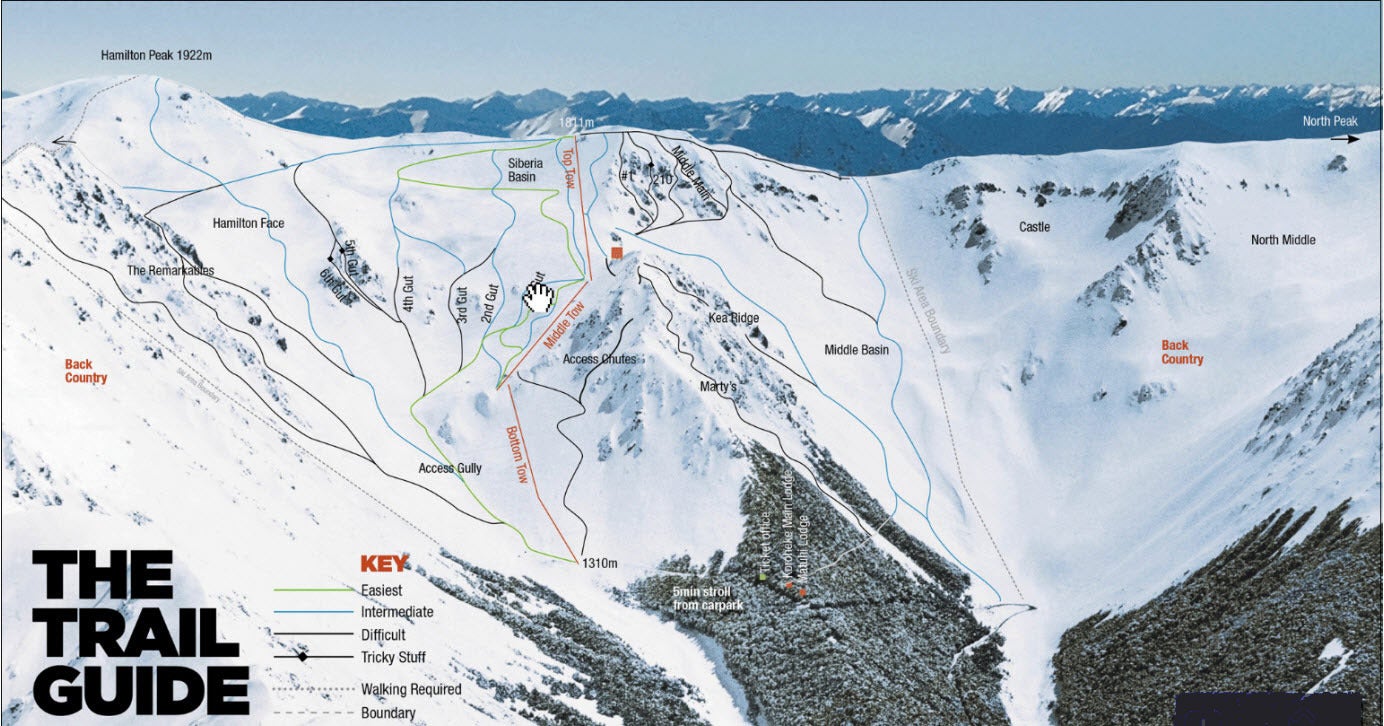 Le domaine skiable de Craigieburn est réparti sur deux grands bassins alpins : Middle Basin et Hamilton Peak. Ces zones offrent des pentes variées, des crêtes exposées et des descentes techniques accessibles par les trois remontées de surface. Le terrain est entièrement non damé, ce qui garantit une expérience de glisse naturelle et stimulante.