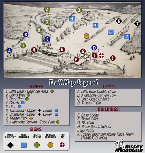 Plan des pistes - Tussey MountainLe plan des pistes vous offre une vision globale et complète du domaine skiable, des pistes et des remontées mécaniques de Tussey Mountain. Alors un conseil, avant de partir, pensez à imprimer le plan des pistes de Tussey Mountain !Cliquez pour agrandir le plan des pistes.